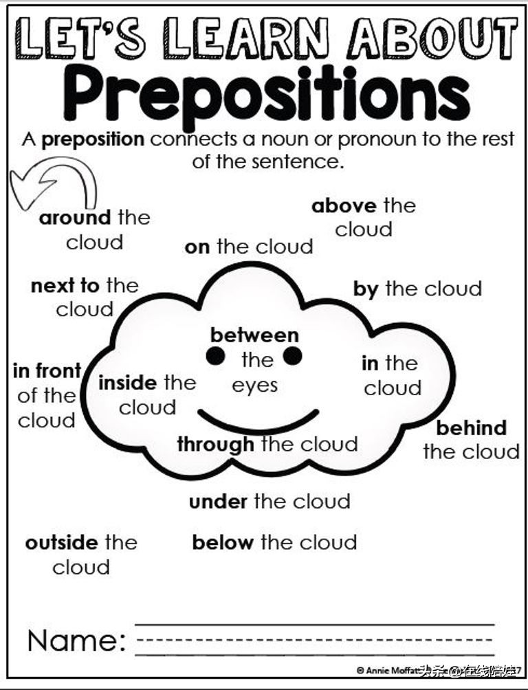 比如在介词使用练习中,首先通过一张白云图,帮助孩子们理解in、on、above、behind...这些介词对应的位置关系。