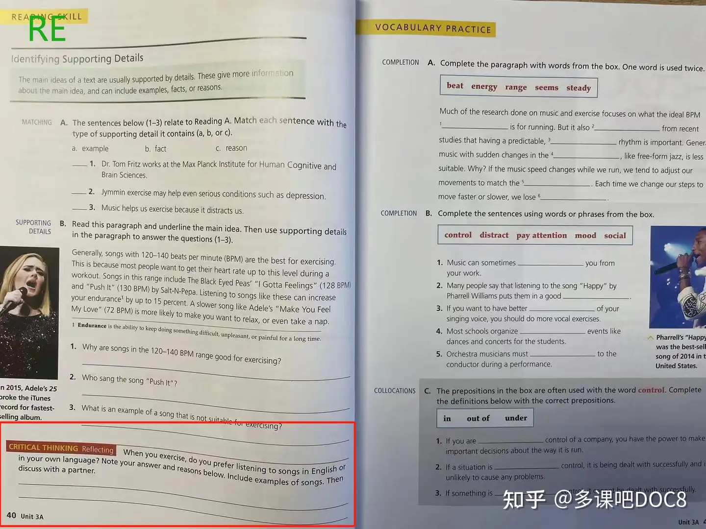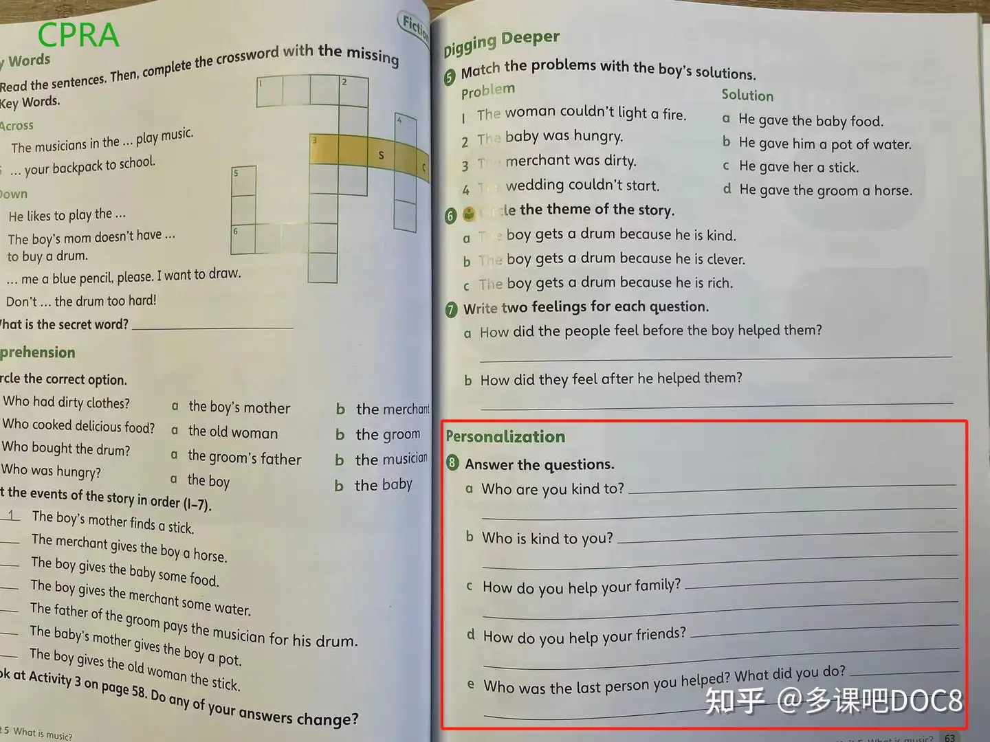 此外,问题的难度会有所不同。 在CPRA的After reading的部分,会问孩子“Who are you kind to?”“Who is kind to you?” 等5个问题,循序渐进。 相对比,RE的问题会更复杂一些,对回答者的英语水平要求会更高:“When you exercise, do you prefer listening to songs in English or in your own language? Note your answer and reasons below. Include examples of songs. Then discuss with a partner. ”