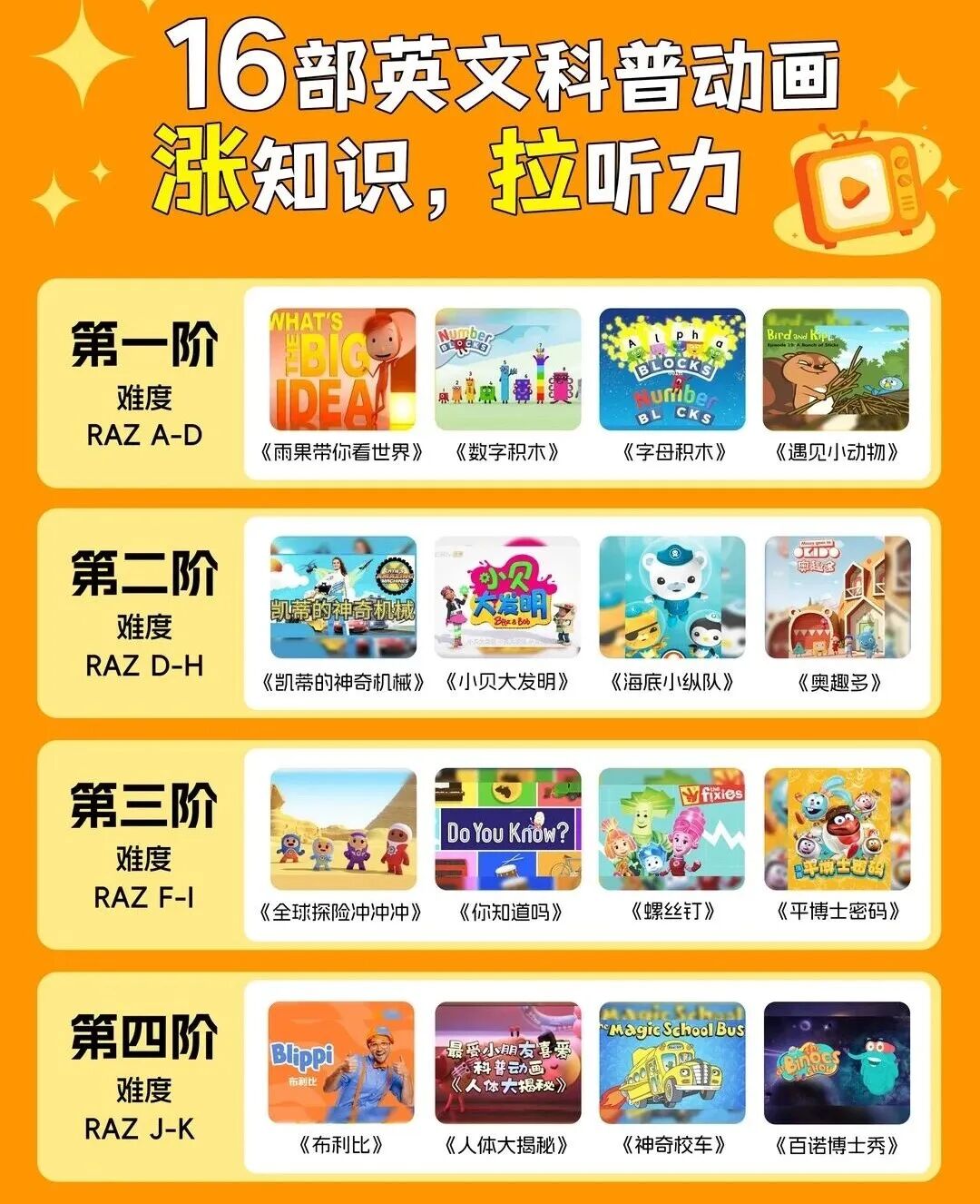 对应动画:小爱因斯坦Little Einsteins(初阶)、Ask the StoryBots问问故事机器人(中阶)、story bots netflix(中阶)、神奇校车(中阶)、平博士密码(中阶)、Brainpop 295集(中阶)、BrainPOP人物传记(高阶),覆盖初、中、高三个梯度,与通识科普“全面、系统”的核心需求相契合,其中初阶侧重基础通识启蒙,中、高阶内容更全面、更深入,适合需要系统拓宽知识面、提升英语能力的学习者。