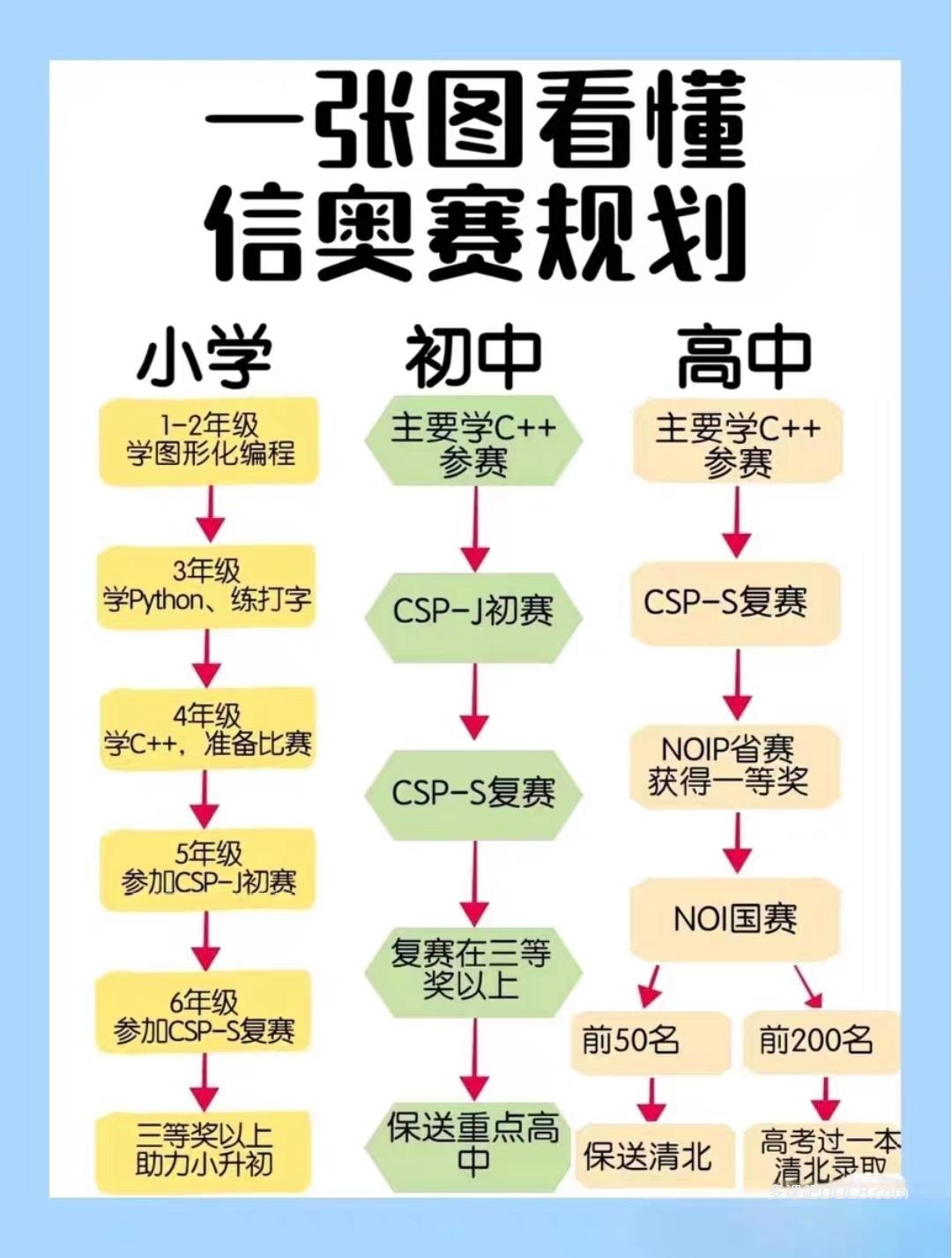 - 冲击高含金量奖项:在学好C++后,主攻 NOC、信息素养大赛(白名单),并通过 GESP 向 CSP-J/S 和 NOI 进阶。