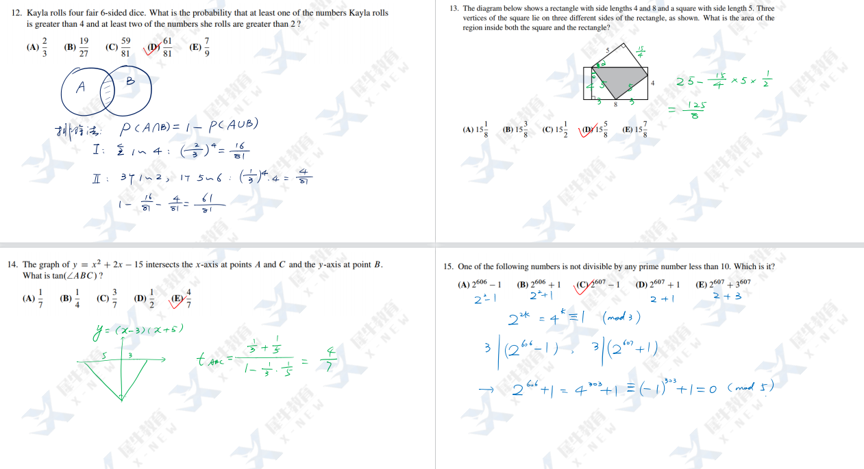 AMC10竞赛考试内容涵盖初三和高一数学课程内容,包括初等代数、基础几何学(勾股定理、面积体积公式等)、初等数论和概率问题。不包括三角函数、高等代数和高等几何学知识。AMC12 涵盖以上全部内容,但不包括微积分。