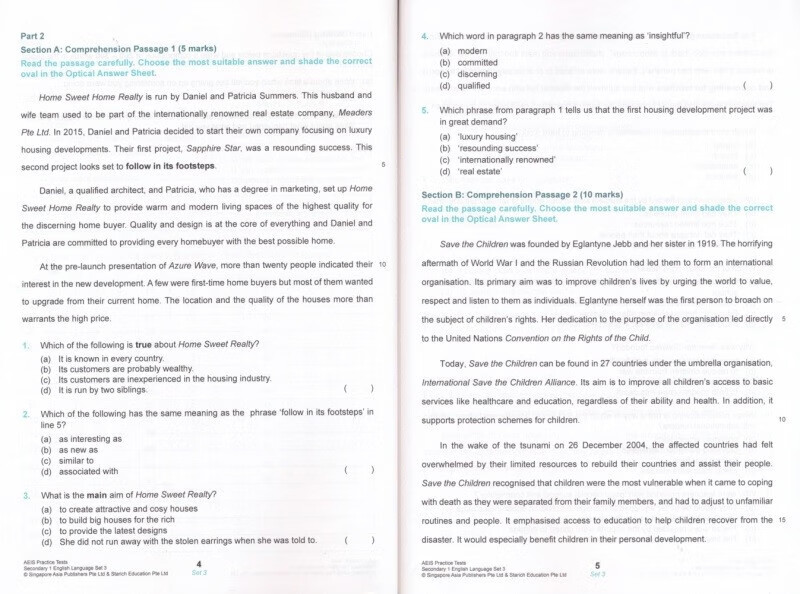 需要注意的是,自2023年起,新加坡政府小学阶段的AEIS英文考试已被剑桥英语资格考试(CEQ)取代,但中学阶段(S1-S3)的AEIS英语考试保持不变。本套模拟题针对的正是中学阶段的S1、S2和S3。