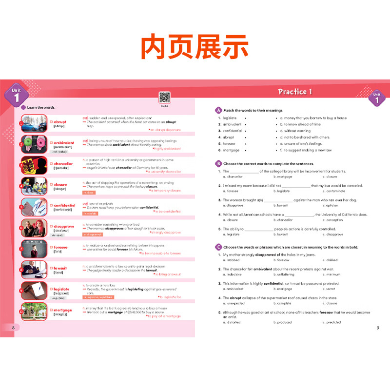 教材采用多种方式促进词汇深度掌握:视觉辅助:配以真实图片帮助建立词汇与形象的直接关联 → 例句示范:每个词都配有实用例句,展示典型用法和常见搭配 → 词族扩展:提供重要词汇的派生形式(如名词、动词、形容词形式) → 发音指导:配套MP3音频由母语者录制,确保发音准确。