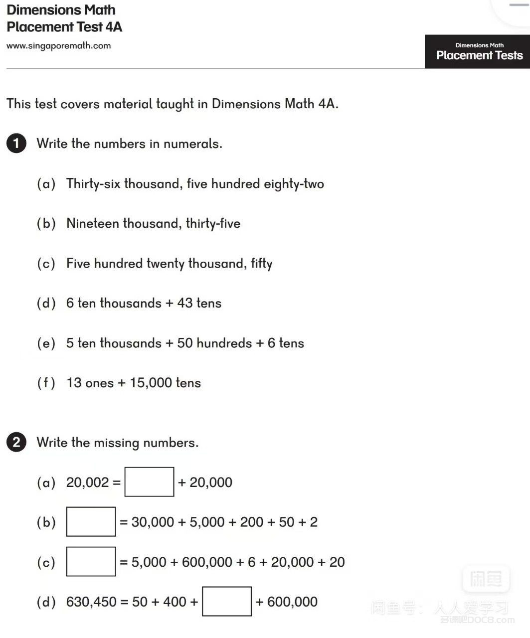 Dimensions Math Placement Tests GK-G5 新加坡数学幼儿园小学数学思维竞赛习题