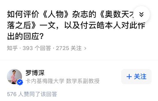 前两年,在一篇关于两次夺得IMO冠军的数学天才付云皓,因大学期间沉迷游戏,导致北大肄业的报道中,罗博深本人还到知乎发表看法,并给予付云皓鼓励。