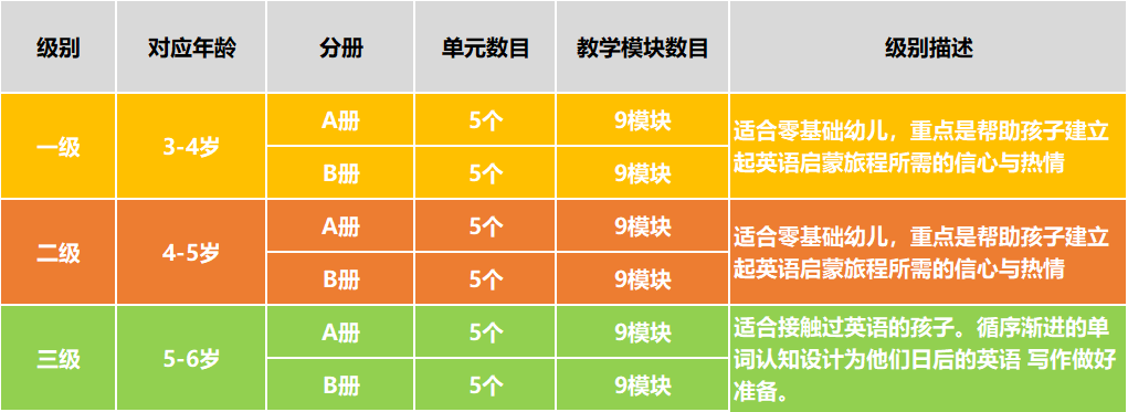 作为一套专门为学龄前幼儿编写的英语课程,总的来说,Super Safari第一级和第二级适合英语零基础的孩子;第三级适合有一定英语基础的小朋友。我们专门制作了一张对照表,如下图所示: