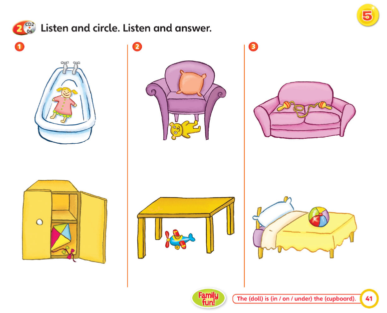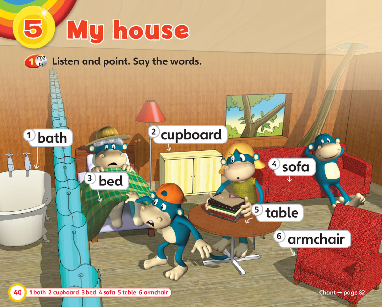 第三级,孩子会接触到更多分类细致的话题,比如My house,Party clothes,All aboard 等等。比如,这单元的主题是关于家里的陈设,孩子会学到: