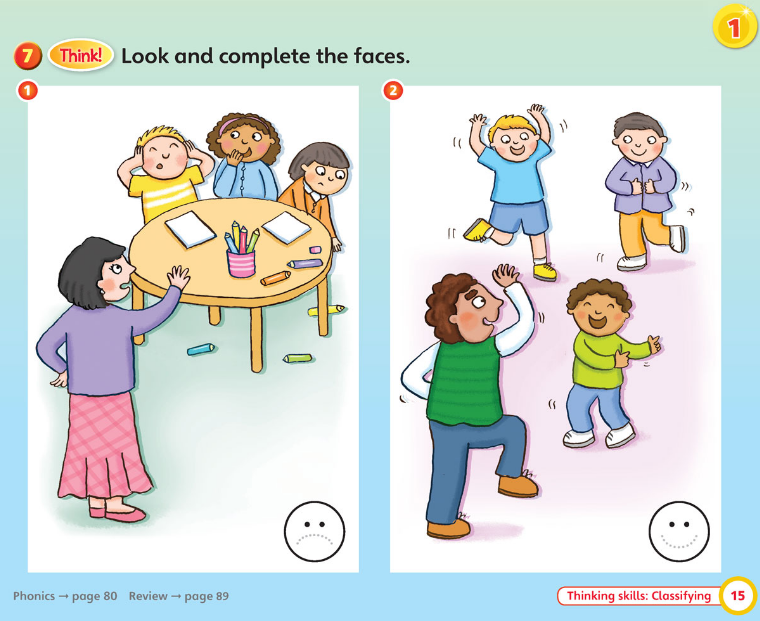 作为一套侧重于从一开始培养幼儿英语思维的教材,Super Safari 非常强调孩子要直接用英语去思考问题。比如,第一级中,让孩子看图完成右下角的表情...
