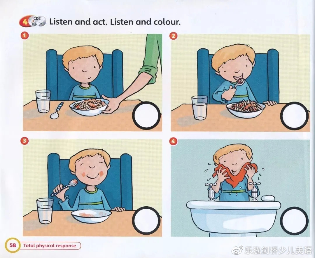 在老师的引导下,孩子听着音频,理解听到的“短句子”和“图片上动作”之间的关系。通过观察这些动作,孩子不用一句翻译,就能理解听到的故事,这就是 “听力理解”!在此基础上,老师指着一张图,孩子慢慢会蹦出一个个词 pasta,eat,wash ... 再逐渐说出包含两三个词儿的短语。