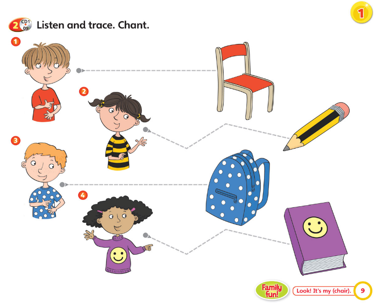 Super Safari在每个单元都会学到一个主要的语法或句型结构。比如,第一级中的:Look! It's my chair.