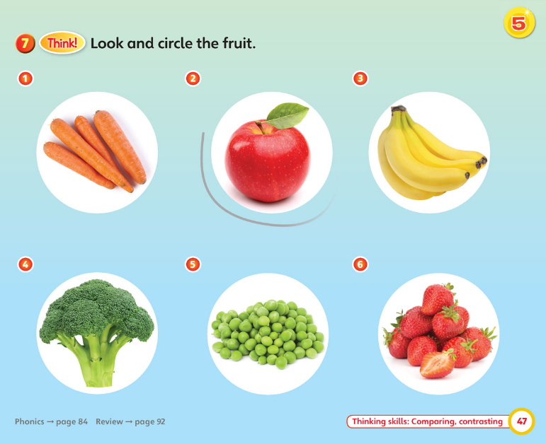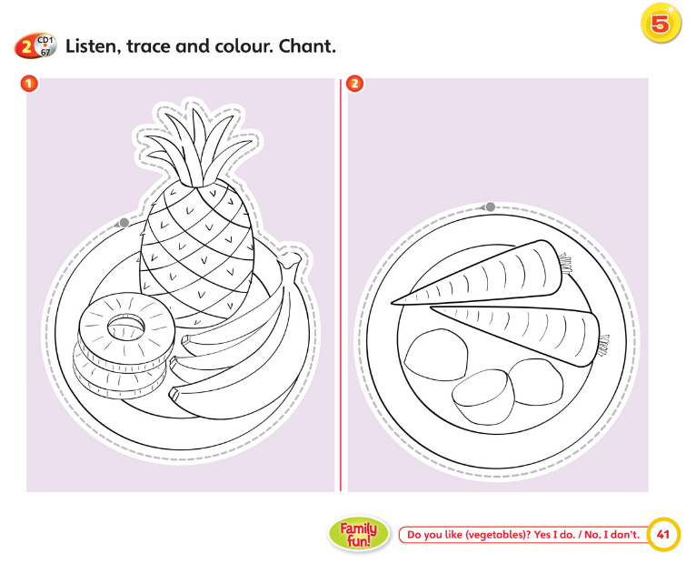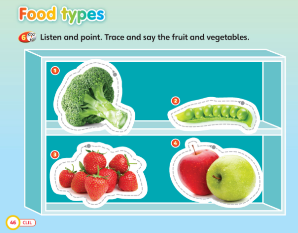 第二级,孩子会接触一些跟社会生活、学科知识联系更强一些的主题:My body, In the jungle, The weather 等等。比如,这课的主题是关于水果和蔬菜,孩子会学到: