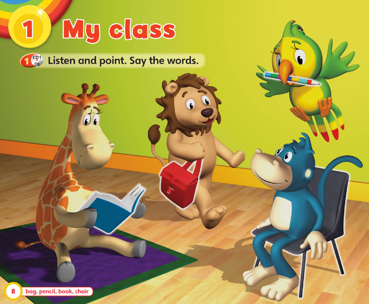 第一级中,孩子主要接触到的是和自己日常生活息息相关的主题:My class, pets, number等等。比如,这一课的主题是 My class,孩子会学到很多跟教室相关的词: