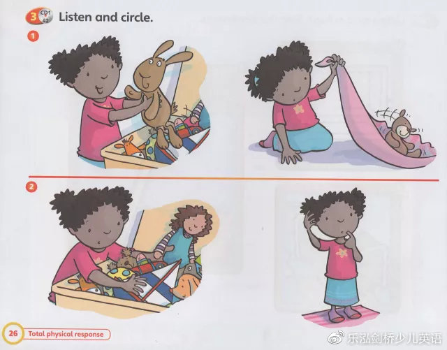 这个部分,是在教师的带领下根据指令做动作,发展幼儿的身体运动感知能力,重点是通过动作行为去理解听到的词汇和短句,形成更好的“听力理解”,并逐渐产生“讲出来”的意识。