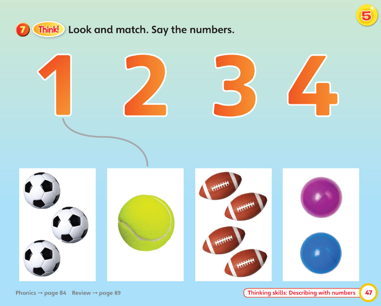 比如这一课,用观察、连线并说出相应数字的英文的练习,让孩子了解数字的概念,这就不是单纯的学英语了,而且用语言去解决问题。