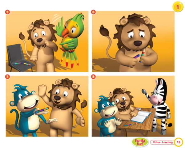 比如这一课,在故事中LEO的铅笔坏掉了,MIKE及时伸出援手帮助了他,通过聆听这个故事,及教师的引导,孩子可以学习互帮互助的美德。