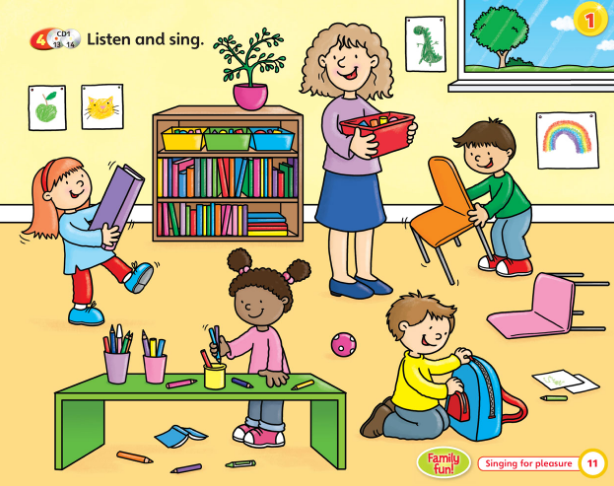 听和唱之前,教师要带孩子复习一下之前学过的单词;比如这段歌曲中会出现的Tidy up、book、chair等...