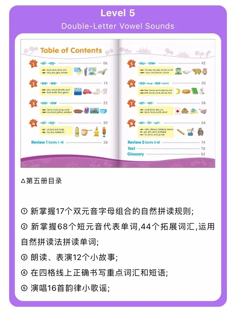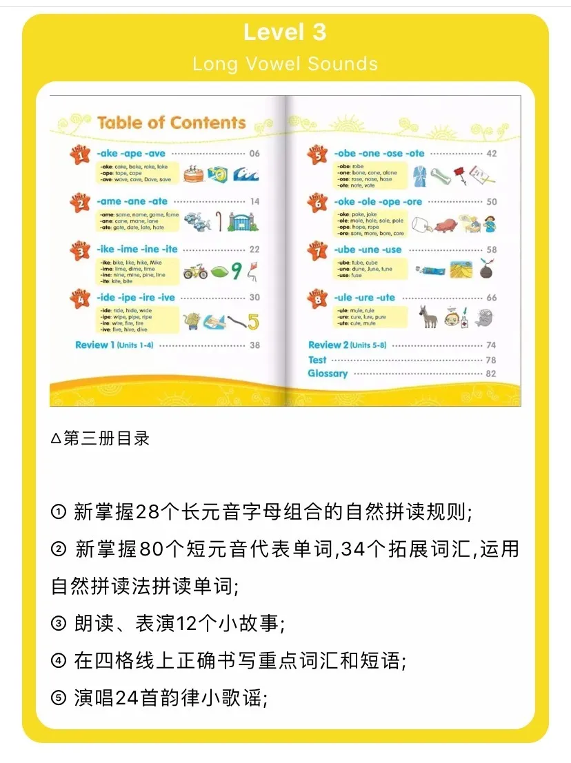 韵律歌谣与课后作业能帮助孩子巩固所学的发音规律,拓展发音技巧。