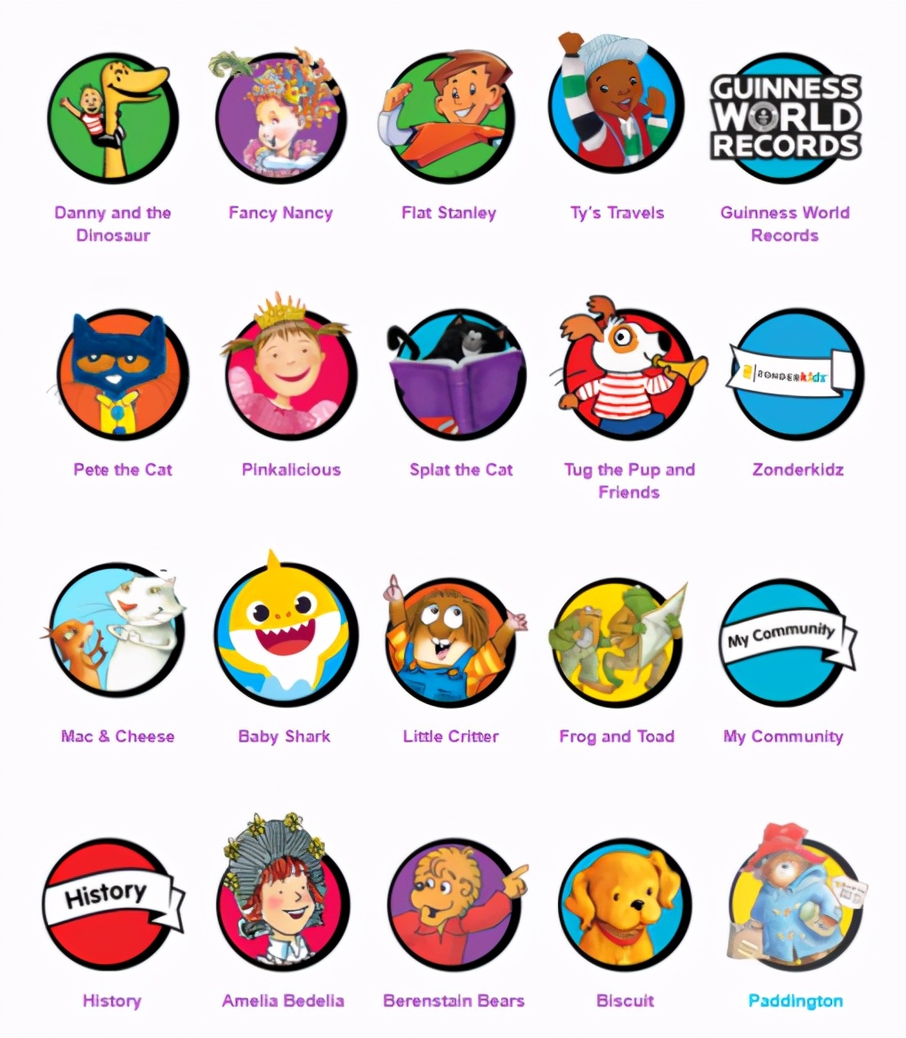 官网中有介绍6个卡通角色:Biscuit(饼干狗)、Fancy Nancy(小俏妞南希)、Little Critter(小怪物)、Pete The Cat(皮特猫)、Pinkalicious(粉红控)、The Berenstain Bears(贝贝熊)。