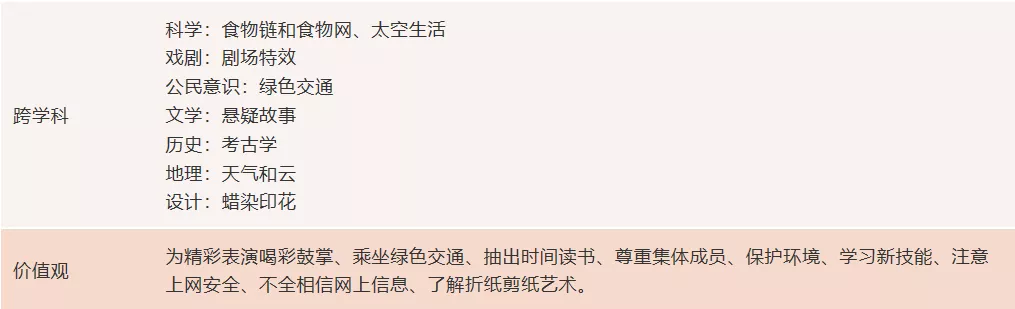 每三个单元安排一次复习单元,检测学生的学习情况,巩固复习知识。每一课是遵循“参与-练习-交流”的学习步骤。教材内容丰富,条理清晰,从词汇、语法、阅读、学科拓展等方面,构建独特的英语学习知识体系。Starlight教材最大的特色是采用了CLIL教学法。CLIL (Content and Language Integrated Learning) 教学法,即内容与语言整合教学法。Starlight的每个单元都会结合主题选择一门学科,用英语去接触诸如艺术、社会科学、人文、历史、体育等科目,并通过了解这些科目来学习和巩固英语。