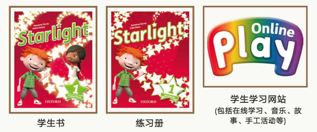 Starlight教材配套分为两大块,有学生配套和教师配套。学生配套包括学生书+练习册,以及学生学习网站(包括在线学习、音乐、故事、手工活动等)。