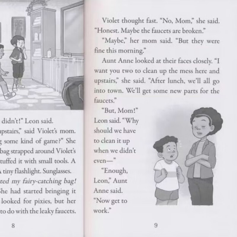 - 情节框架:每本书都是一个独立完整的魔法冒险,围绕一扇被意外打开的“精灵门”和跑出来的某个精灵引发的麻烦展开。这种“单元剧”模式降低了阅读压力,孩子不需要记忆复杂的前情提要,随时随地可以进入一个全新的小冒险。