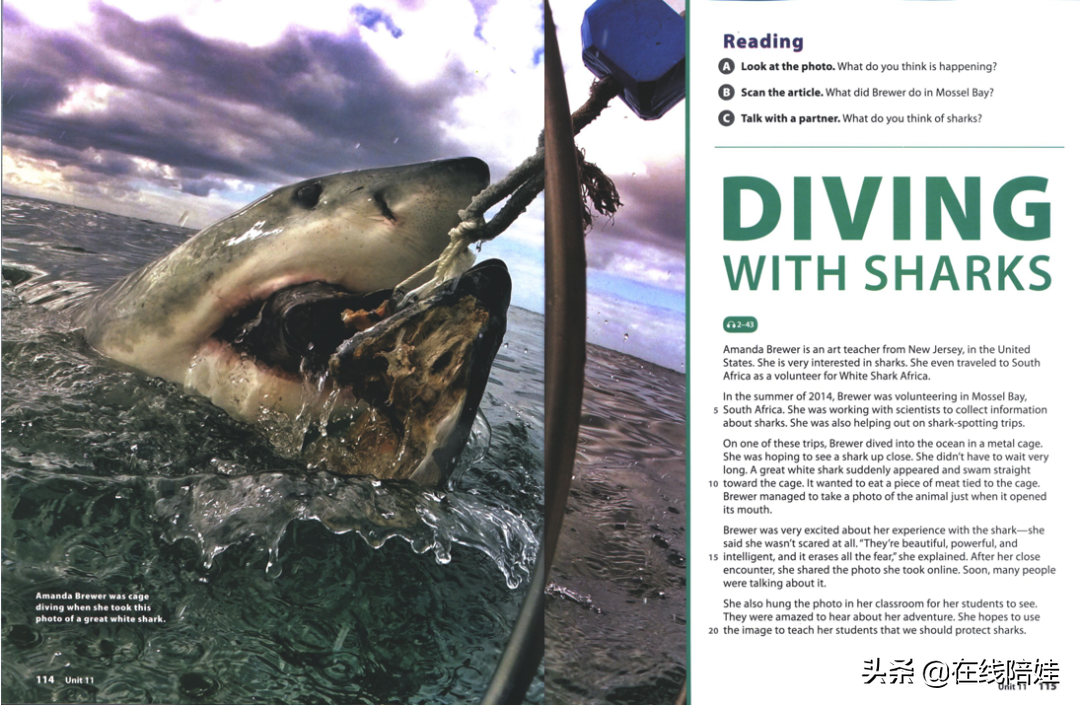 与鲨共舞是怎样一种感受?有没有被大白鲨的特写照片吓到?相信看到这张图片,孩子在学习本单元内容的时候,一定是带着探究的心态,去体验故事主人公的经历。