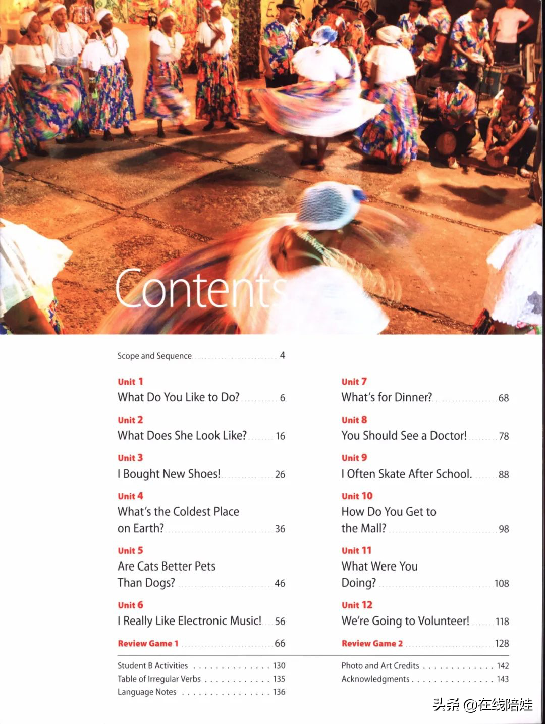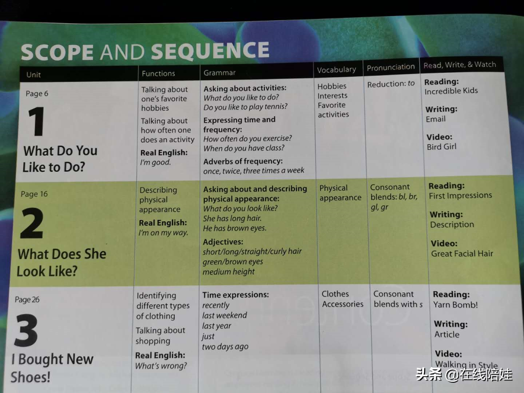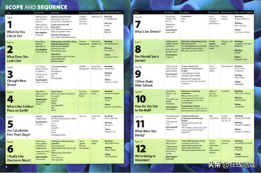 主目录后边,还会有一张详细的目录,分别从语用(Function)、语法(Grammar)、词汇(Vocabulary)、发音(Pronunciation)、阅读&写作&视频(Read、Write and Watch)5个部分仔细介绍每个单元的知识点。脉络清晰,编排科学。