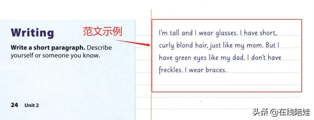 在最后的写作练习部分,要求学生根据所学内容描述一下自己或者自己认识的人,并右侧给出范文文本。