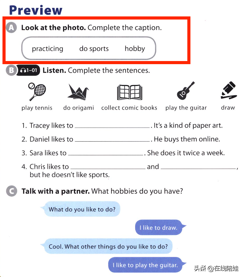 C的部分是口语练习。根据给定的话题(如你最喜欢的爱好),练习不同的句式。小朋友在练习的过程中,可以积累常见的口语句式,如: What do you like to do? I like to ...等等。