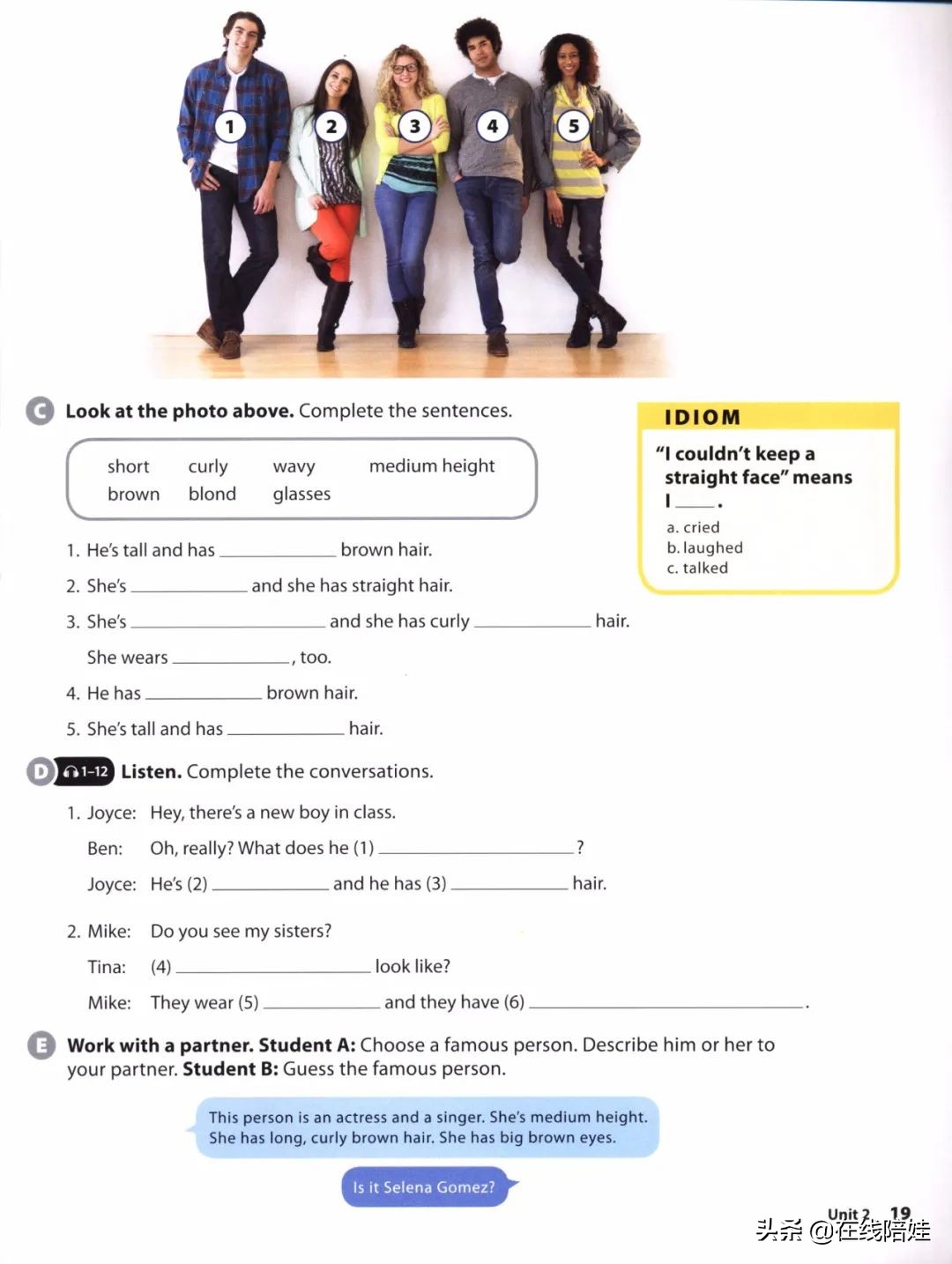 CDE更关注语法的部分。C是副词的练习,根据图片小朋友要找到合适的副词描述。右边有个俚语框,会教给孩子一些与主题相关的俚语,比如下图这句“I couldn't keep a straight face”(我没办法忍住不笑)。
