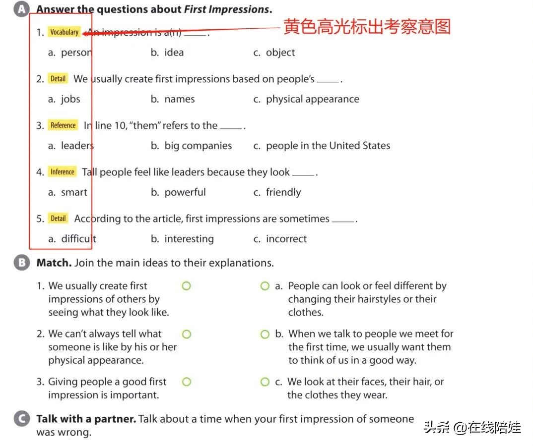在做阅读理解题的时候,我发现这套教材做得非常好的一个细节就是它会在每个阅读理解题前面,用黄色高光文字,为学生标注这道题的考察意图。