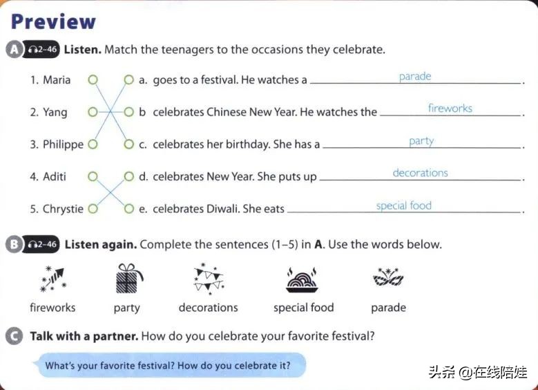 其中A和B是听力训练。先通过听力的形式抛出将要练习的语言素材,在图片上找到下面的Caption(标题或说明)。B的部分要求一边听,一边完成句子填空,这考察孩子手眼并用,并能迅速理解听力材料中的内容。