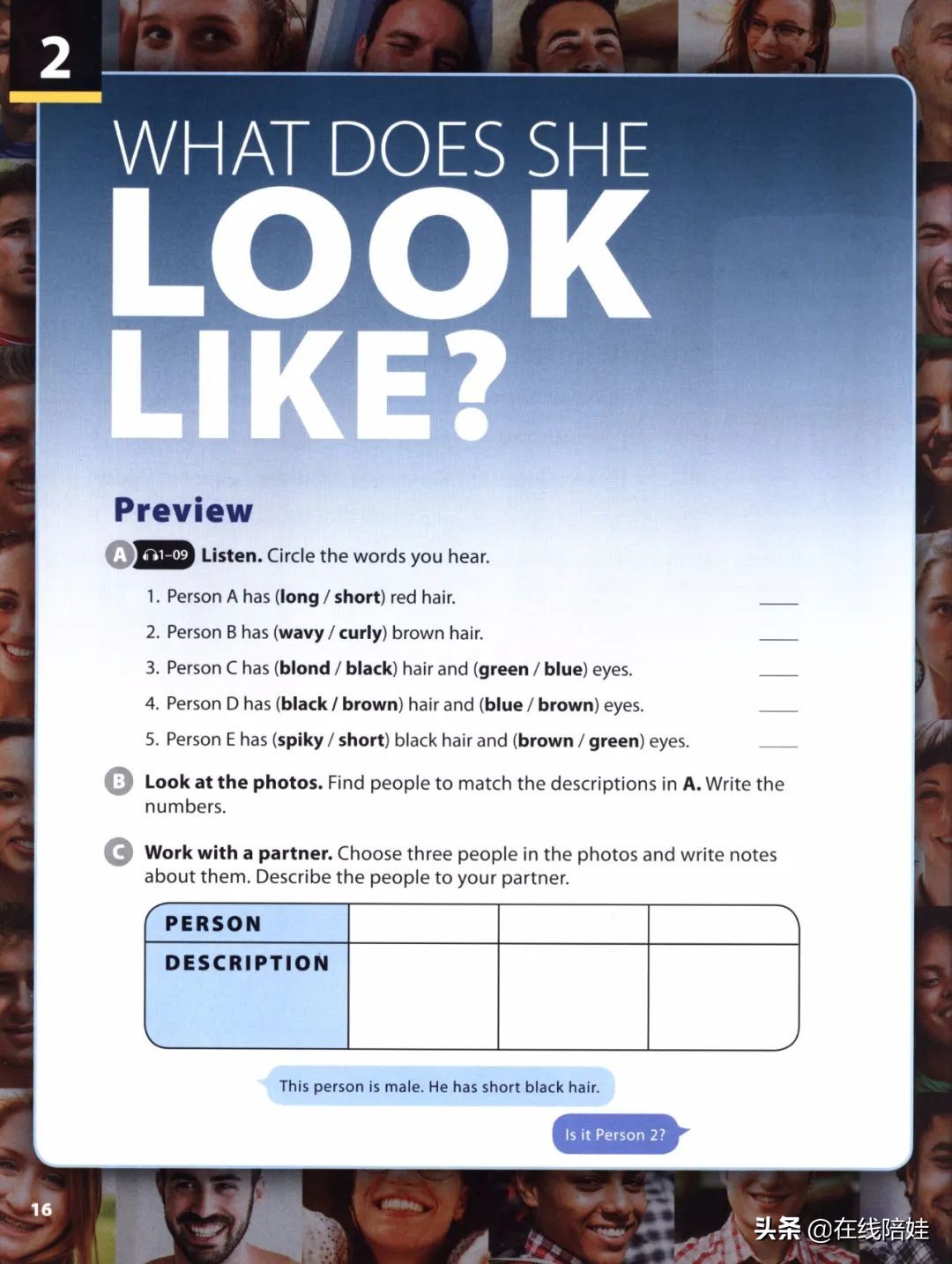 (这一节旨在教孩子如何向别人描述他人的外貌特征)