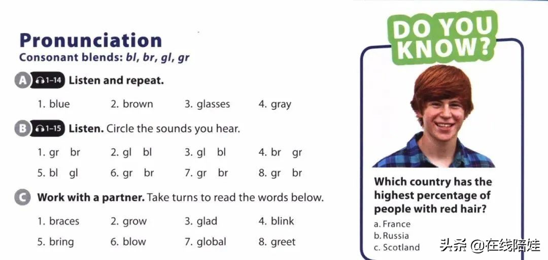 听力过后,教材又聚焦学生的口语和发音能力,通过听音、辨音、跟读的形式,让学生的口音越来越标准、地道。右边的"Do You Know"还特意加入了一些趣味小知识,为学生提供更多可互相交流的话题、丰富学生的见识。