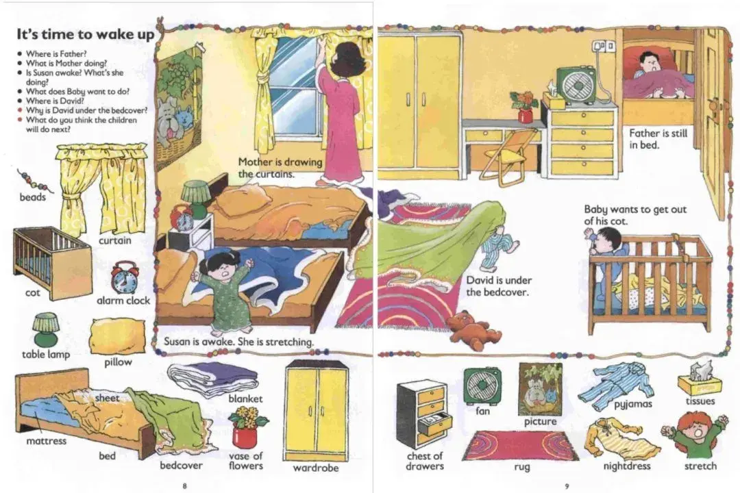 - 双通道输入模型:图文同步激活大脑颞叶(语言处理)与枕叶(视觉处理),如“浴室场景”中牙刷(toothbrush)图片旁标注“I brush my teeth every morning”,形成实物-单词-行为的神经链接。