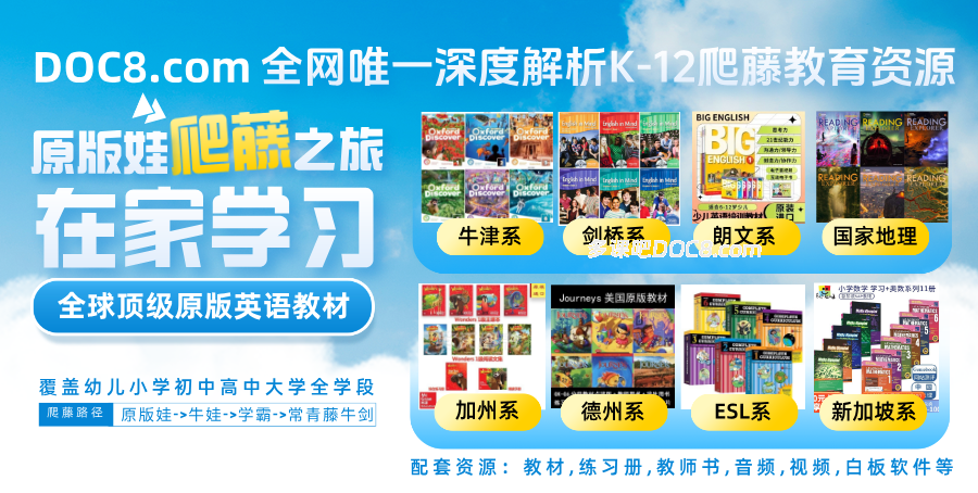 为帮助大家顺利开启原版娃升级之旅——原版娃->牛娃->学霸->常青藤牛剑,我们将按照英国牛津Oxford、英国剑桥Cambridge、培生朗文Pearson Longman、国家地理National Geographic、美国加州California、美国德州Texas、美国ESL、新加坡Singapore SAP共8个系列给大家介绍、推荐全球顶级原版英语教材,覆盖了幼儿、小学、初高中全学段。同时,为方便大家在家下载学习,备考KET/PET/FCE和中高考,并提供实体产品购买参考,本站已为大家搜集整理了各系列对应的全彩高清PDF教材(部分为点读版,包括学生用书Student's Book、教师用书Teacher's Book、练习册Workbook等)、MP3音频、MP4视频、PPT教学课件、白板软件等配套资源。