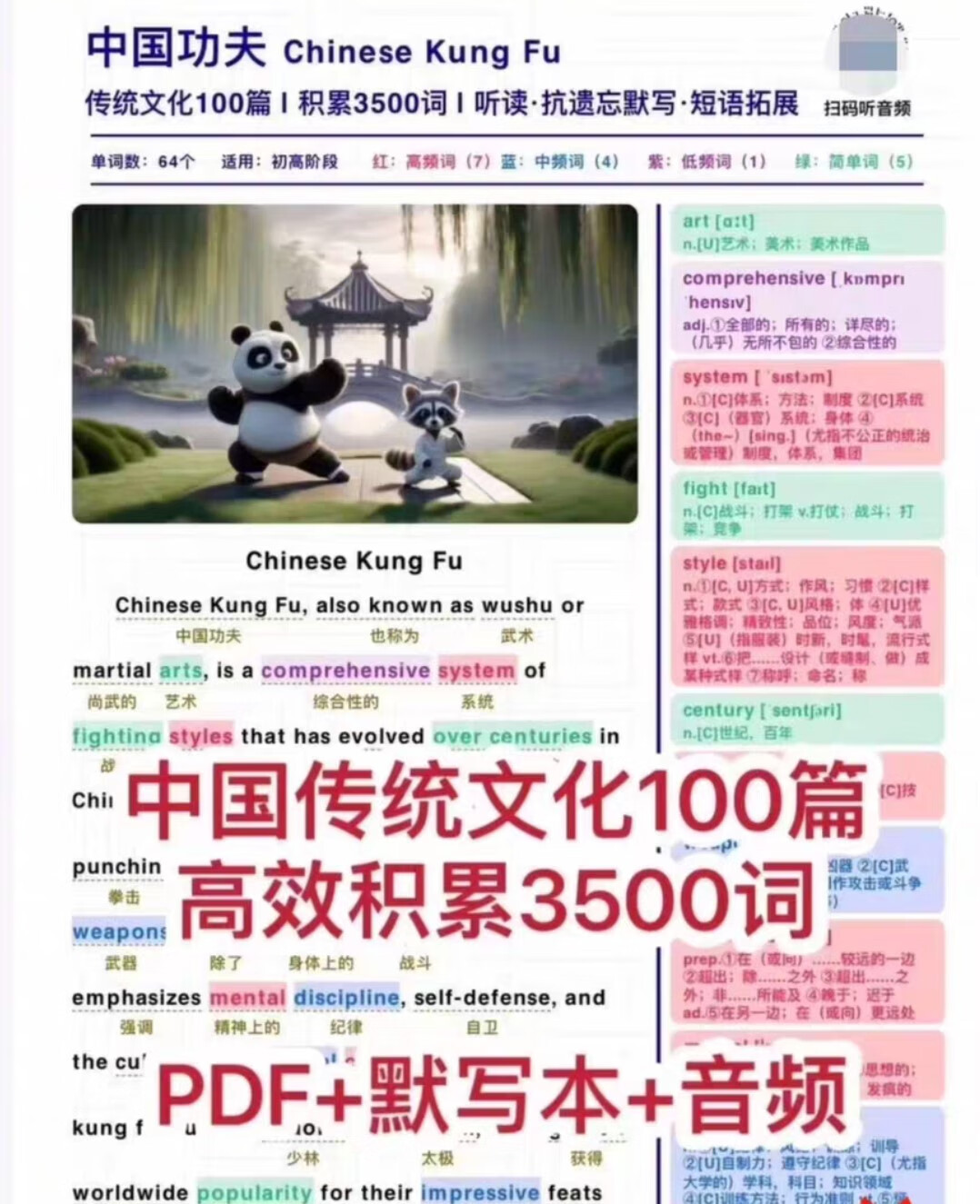 这是市面上唯一将中国传统文化与英语词汇学习深度融合的系统性资源。从功夫到节气,从诗词到非遗,让学生在学英语的同时,掌握用英语传播中国文化的能力。