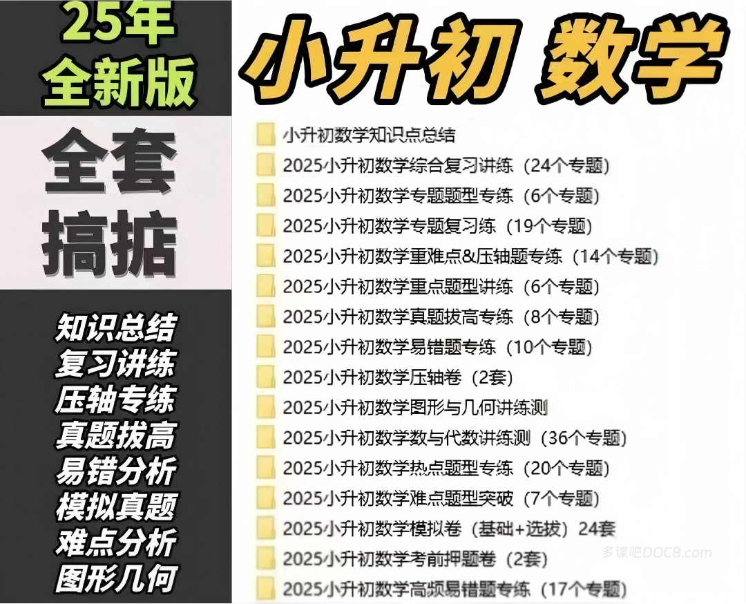 | 名校招生/模拟试题 | 小升初重点中学-数学模拟试题及答案、名校小升初数学真题及答案.doc | 价值:难度通常高于普通毕业考,适合目标为重点初中、实验班的学生进行拔高训练。 建议:挑战自我,见识难题、巧题,锻炼在压力下的思维灵活性。 |
