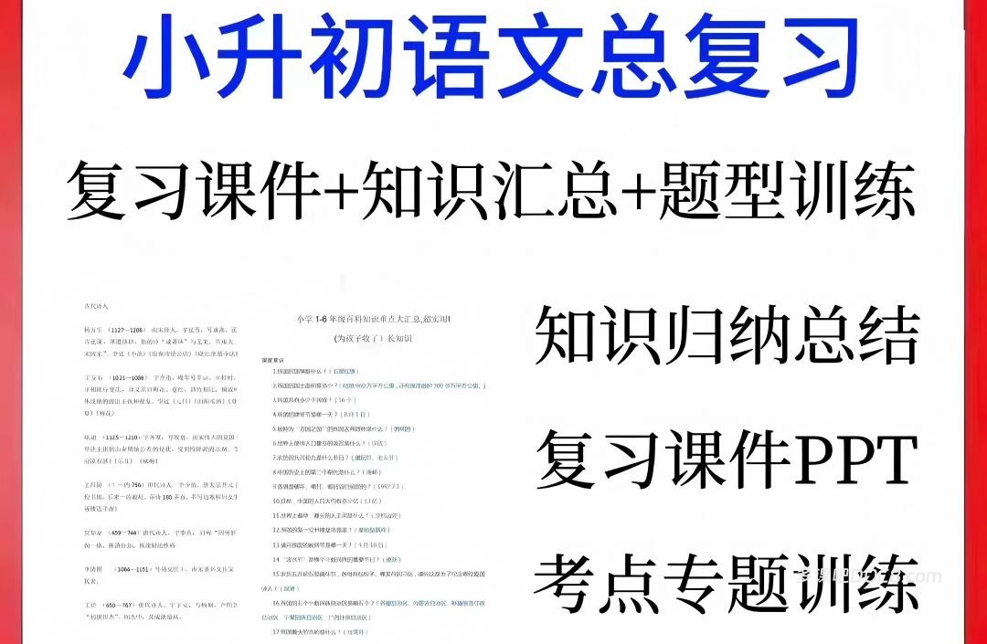 | 2. 专题讲练套件 | 一套完整的“统编版小升初语文总复习”专题(至少17个专题)。每个专题包含知识讲解PPT+专项练习+答案,形成“讲-学-练-测”闭环。 | “模块化”攻坚利器。这是资源包中系统性最强的部分,专攻拼音、汉字、词语、句子、阅读方法等核心难点,适合进行系统性、针对性突破。 |