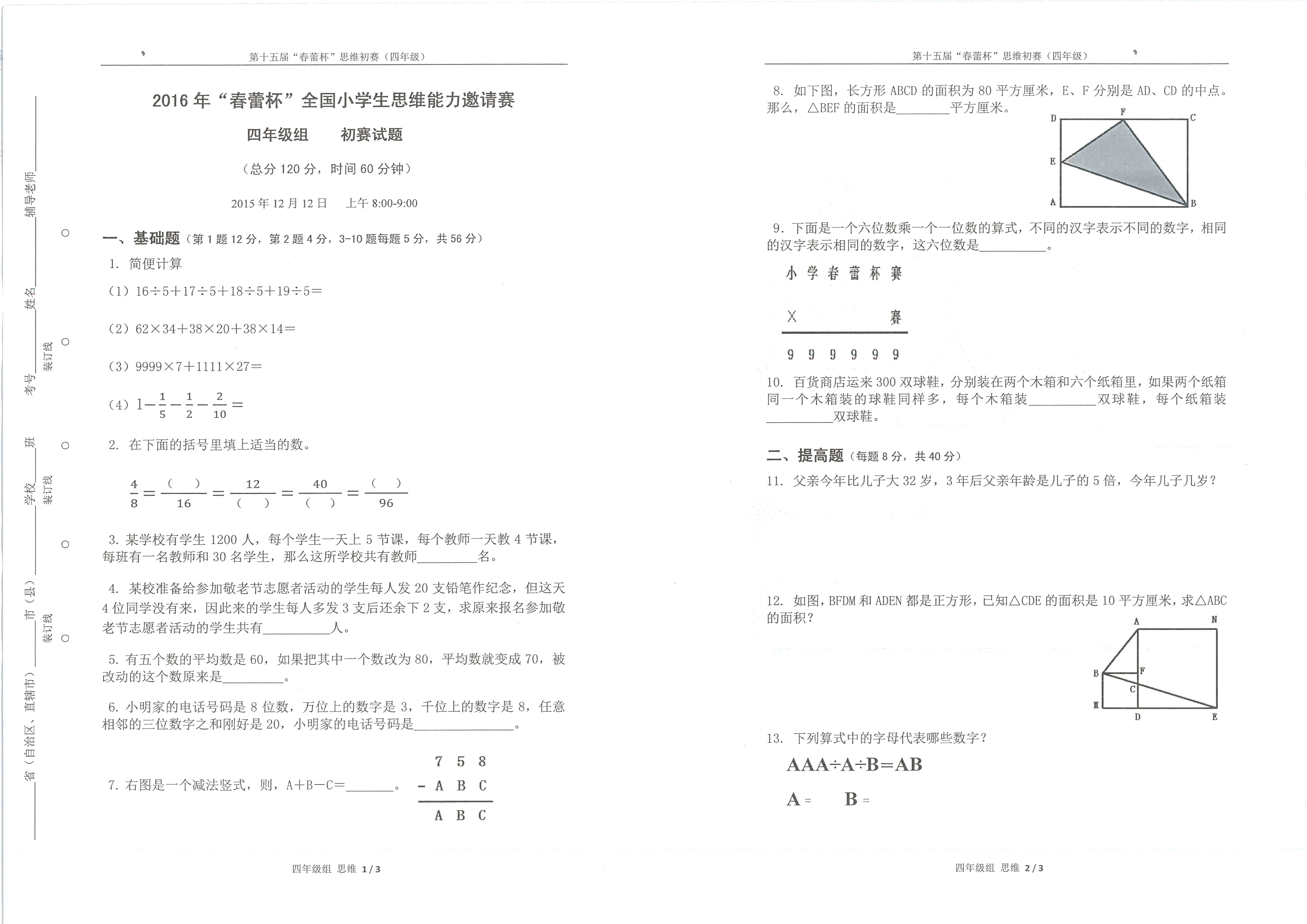 | ├──2016年“春蕾杯”三年级(初赛试卷)全国小学生数学思维能力邀请赛 通用版(PDF版,无答案).pdf 1.14M