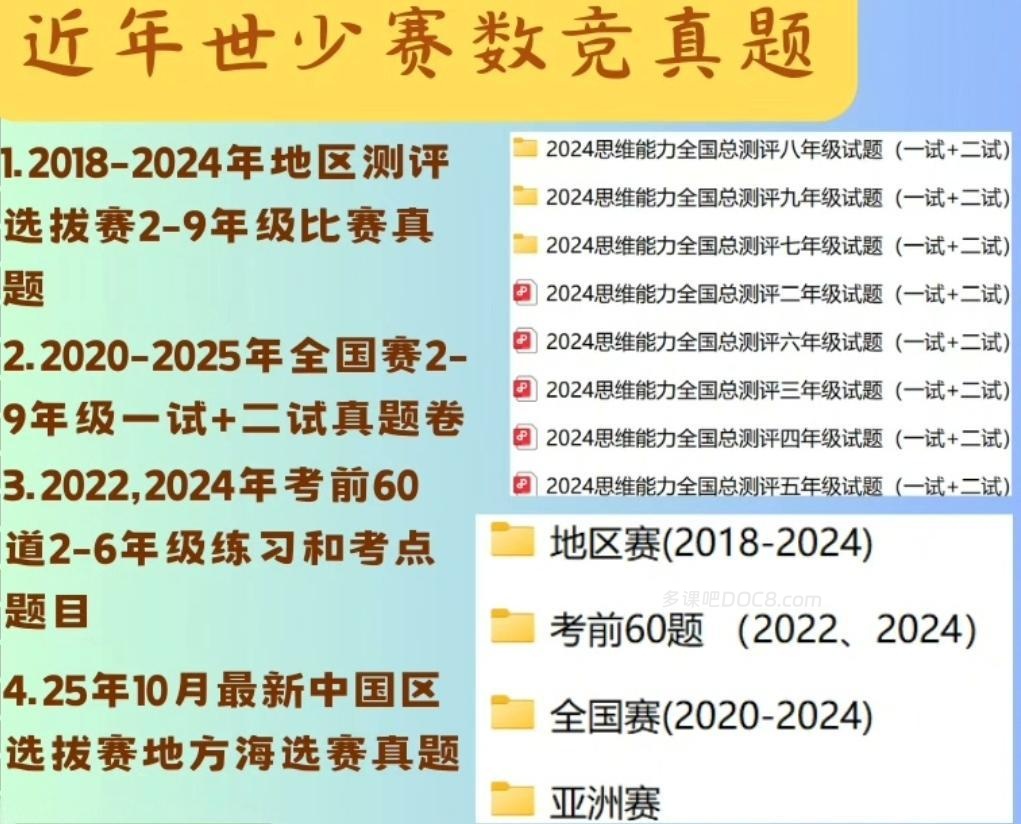 本套2025年世少赛备考资源合集,内容全面、结构清晰、实用性极强,涵盖了从地区赛到亚洲赛的历年真题与详解,为备考世少赛提供了丰富且高质量的演练材料。