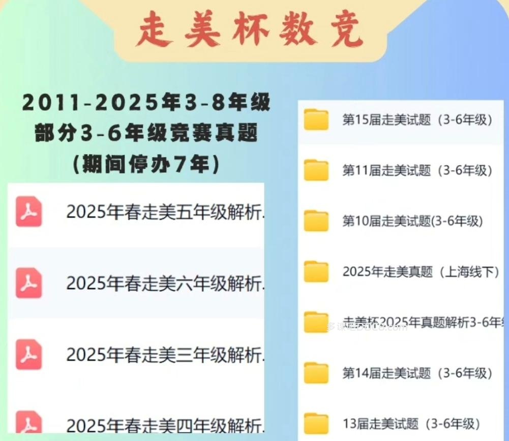 “走美杯”(“走进美妙的数学花园”杯赛)作为国内后起之秀,凭借其新颖的考试形式和适中的竞赛难度,已成为全国范围内最具影响力的数学竞赛之一。本文深度解析的2025最新走美杯历年真题资源合集(2012-2025年,3-8年级),涵盖了从小学到初中的完整内容体系,不仅反映了走美杯13年来的命题演变,也为数学爱好者提供了极为宝贵的思维训练材料。