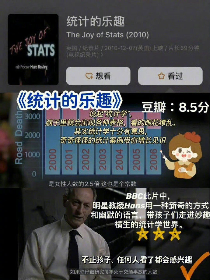 推荐理由:部片子里展示了统计学在人口、安全、卫生、健康等众多领域的应用,特别是统计学在模式识别、数据可视化,机器翻译等方面最新发展和应用,让人们对这门学科充满向往。