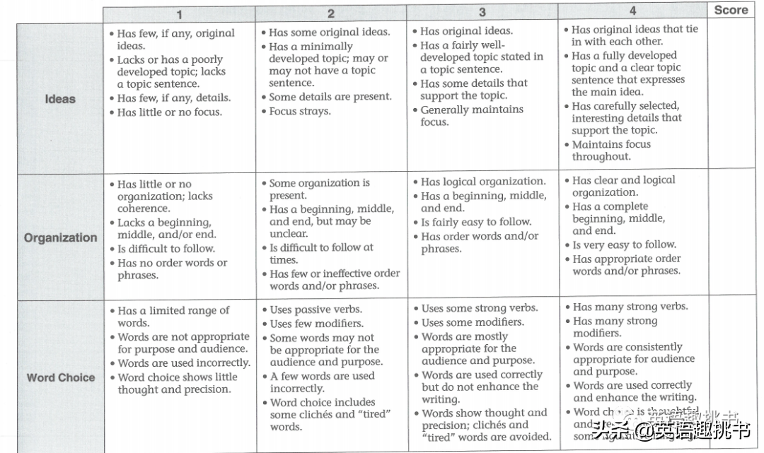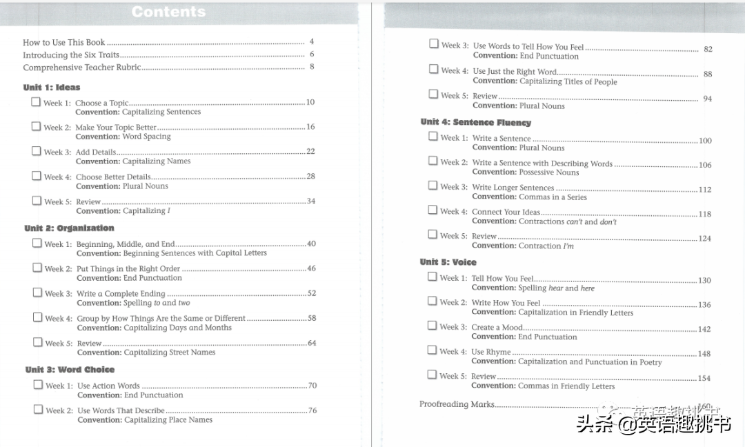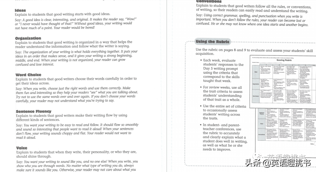 全书从Ideas清晰明确的观点、Organization文章的布局合理、Word Choice准确妥当的用词、Sentence Fluency句子的完整流畅、Voice写作腔调和语言风格、Conventions语法/拼写/标点等文法,即文章主旨-组织结构-选词-句子流利度-语法规则,这六个写作要素着手讲解,是典型的“6要素”写作法。