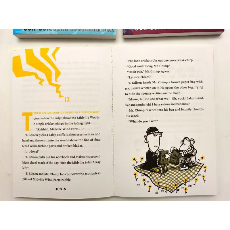 - 科学元素落地:每册聚焦一个科学领域,原理讲解藏在笑话里——比如解释“反物质”时说“就像你吃汉堡时,汉堡突然变成能量把你弹飞”,用“脑涡轮”(BrainTurbo)比喻神经元放电。书中还穿插科学实验步骤(如用柠檬做电池),孩子能跟着动手复现。