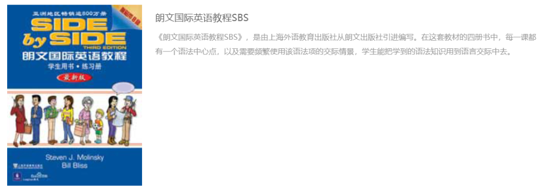 全称side by side朗文国际英语教程,简称SBS,由上海外语教育出版社从朗文出版社引进后改编出版,一共分为四册。
