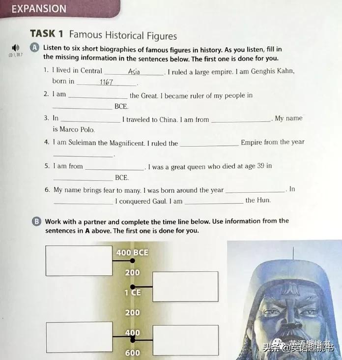 拓展的听力内容更有意思,以第一人称的语气讲述了历史上不同时期的六个帝王的故事,并要求按时间顺序把他们排序。顺带就认识的成吉思汗、马可波罗、奥斯曼帝国等等。