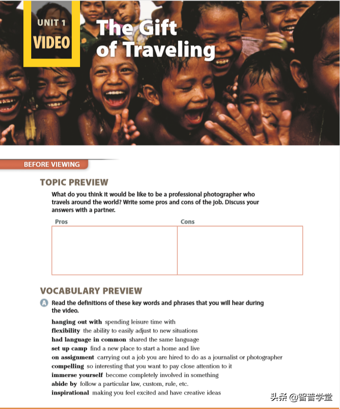 1.真实的《国家地理》视频为重要的听力,笔记和词汇技能的讨论和应用提供了有意义的背景。