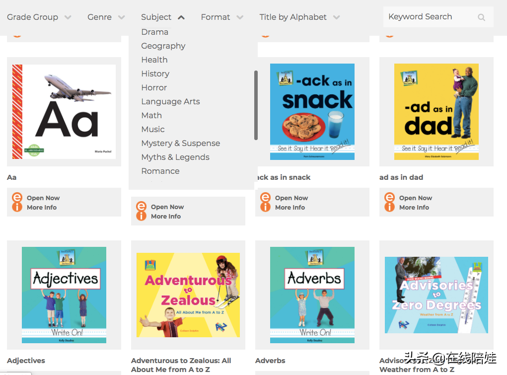 可以按照科目进行选择,这是选择Language Art之后,会出现很多字母、word family、语法之类的相关阅读。