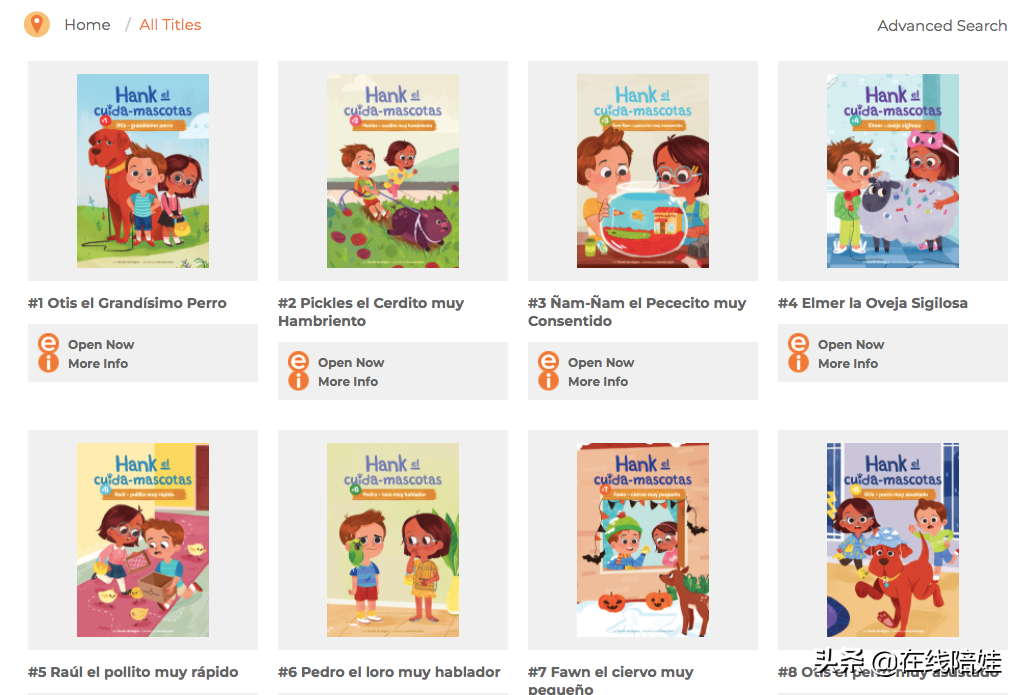 打开网站链接你就直接会看到上面这样一个界面,这一页很多西班牙语的儿童电子书,如果是您的孩子正在学西语,那就额外福利。如果想要找到英语图书,请直接选择分类,用网站上方的目录栏就可以。这是按类型分,有不同的选项,选Beginning Readers,就显示这个界面。